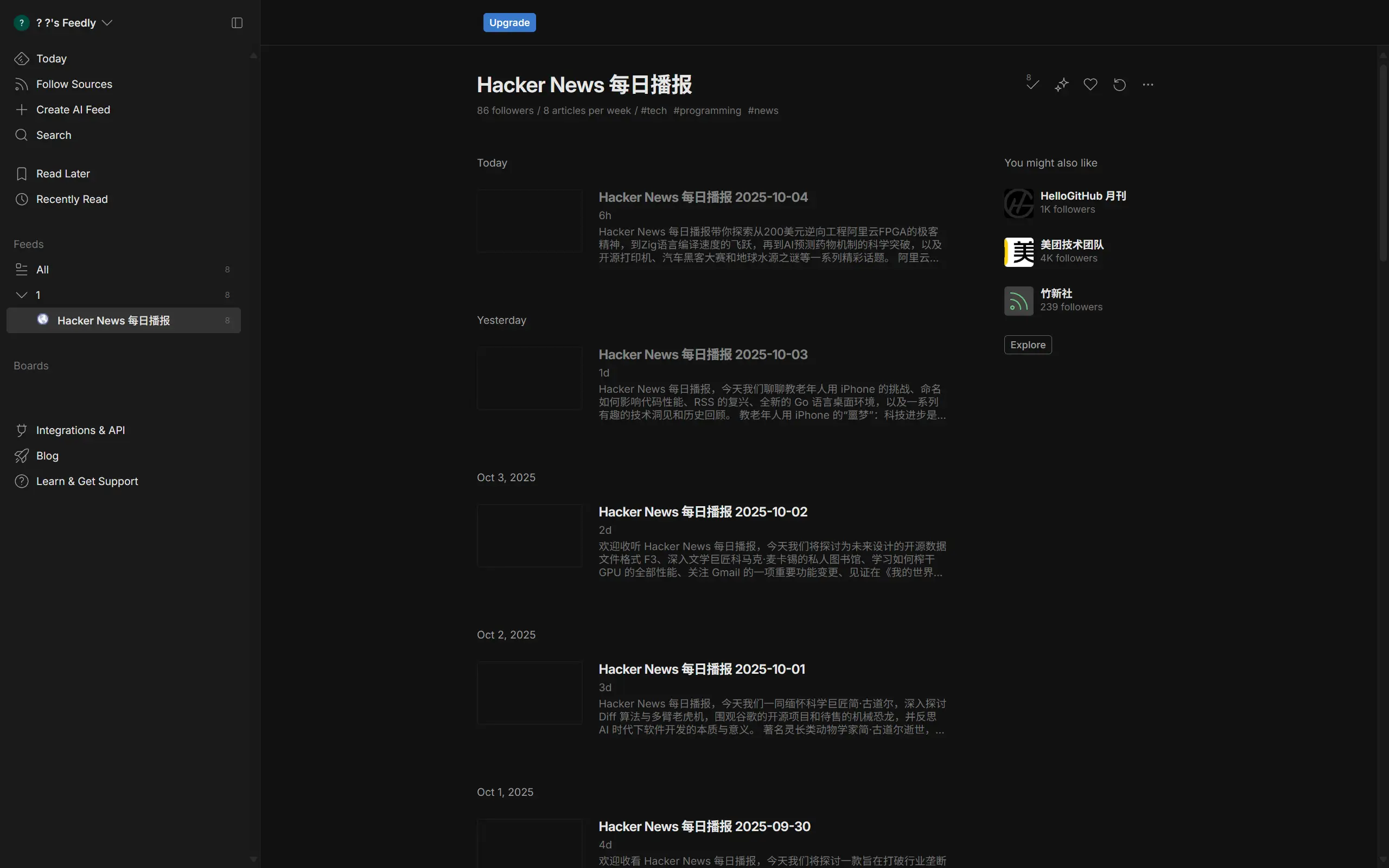 与 RSSHub(开源的 RSS 源生成和分享平台,后面会讲)出自同一制作组,虽然没有 Irreader 那样强大的推送服务,但是他拥有用户间互相分享的数量庞大的 RSS 源,界面也比较漂亮,通过分享自己的 RSS 源还有机会拿到赏金,属于是非常全面的一款产品